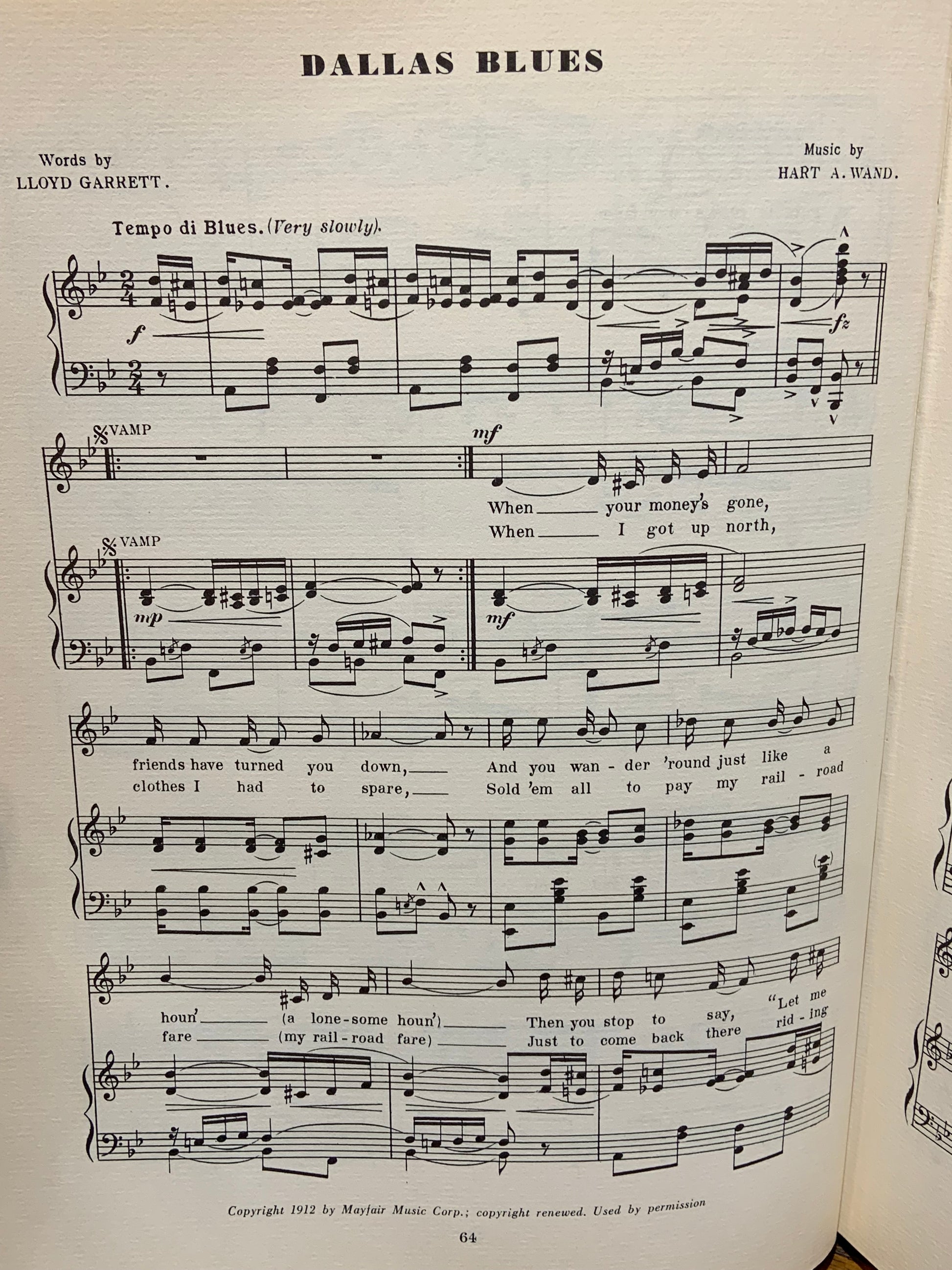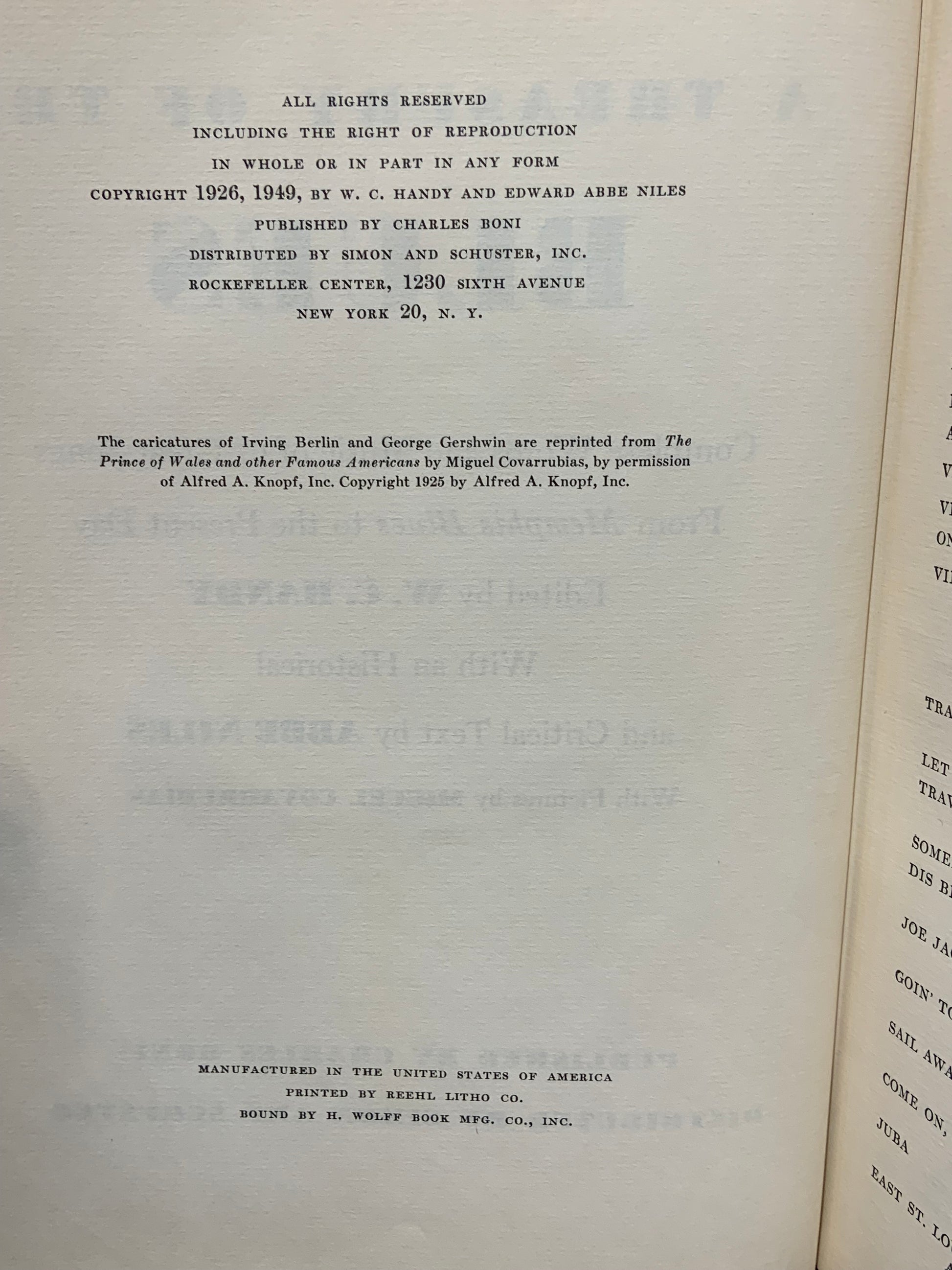 Very good first edition. "Complete words and music of 67 great songs from Memphis Blues to the present day". Light wear and bumping to spine ends, edges, corners. Age-toning to pages throughout, as is common. Good dust jacket. Price-clipped. General wear, including to spine ends and edges, with some chipping. Some rubbing to covers. Overall a nice first edition copy, edited by W.C. Handy, and with a critical text by Abbe Niles