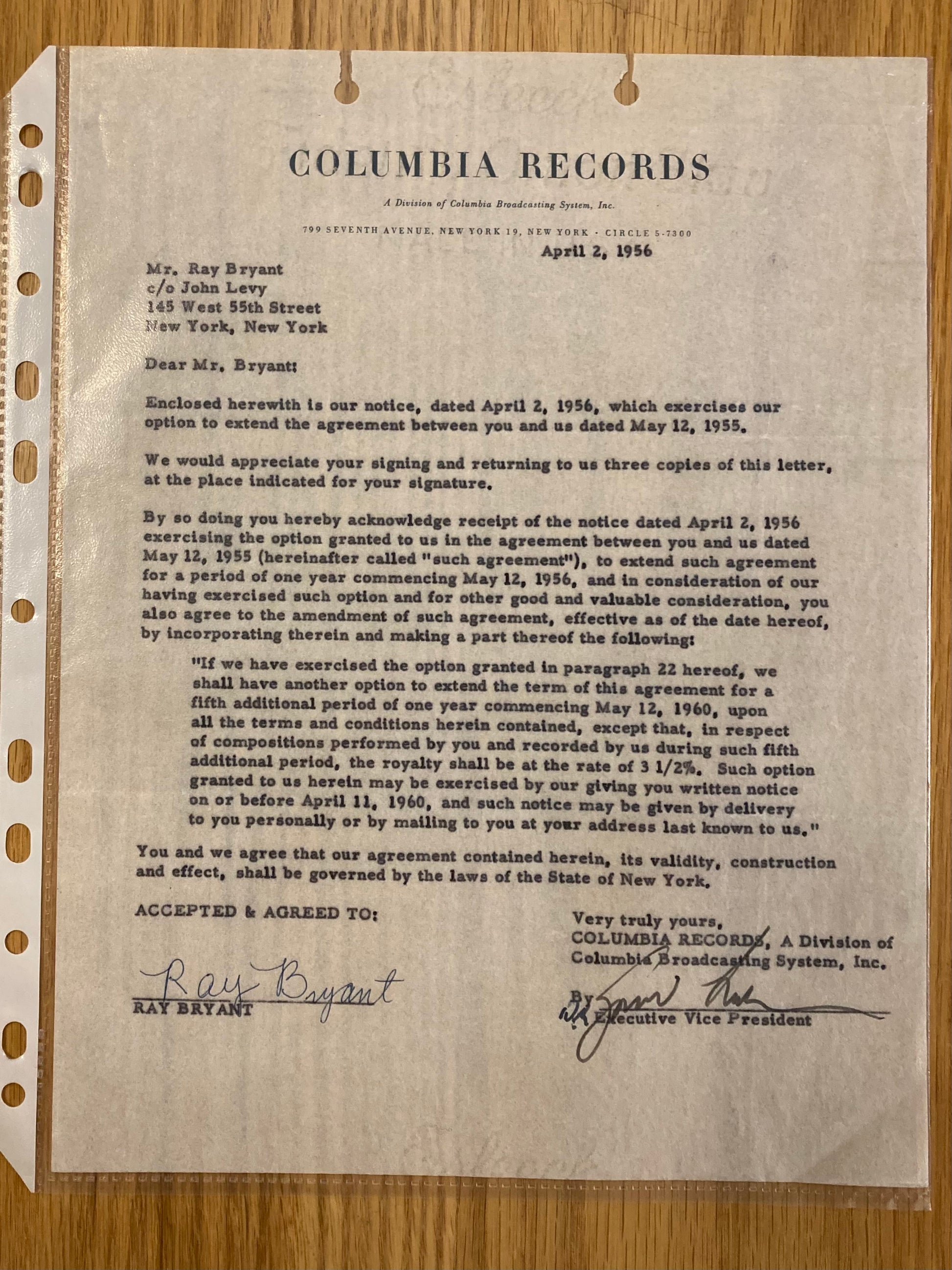 Signed single-paged letter of agreement to extend a contract between Ray Bryant and Columbia records. Signed by jazz pianist Ray Bryant. Slight crease to bottom left corner. Dated April 2, 1956.