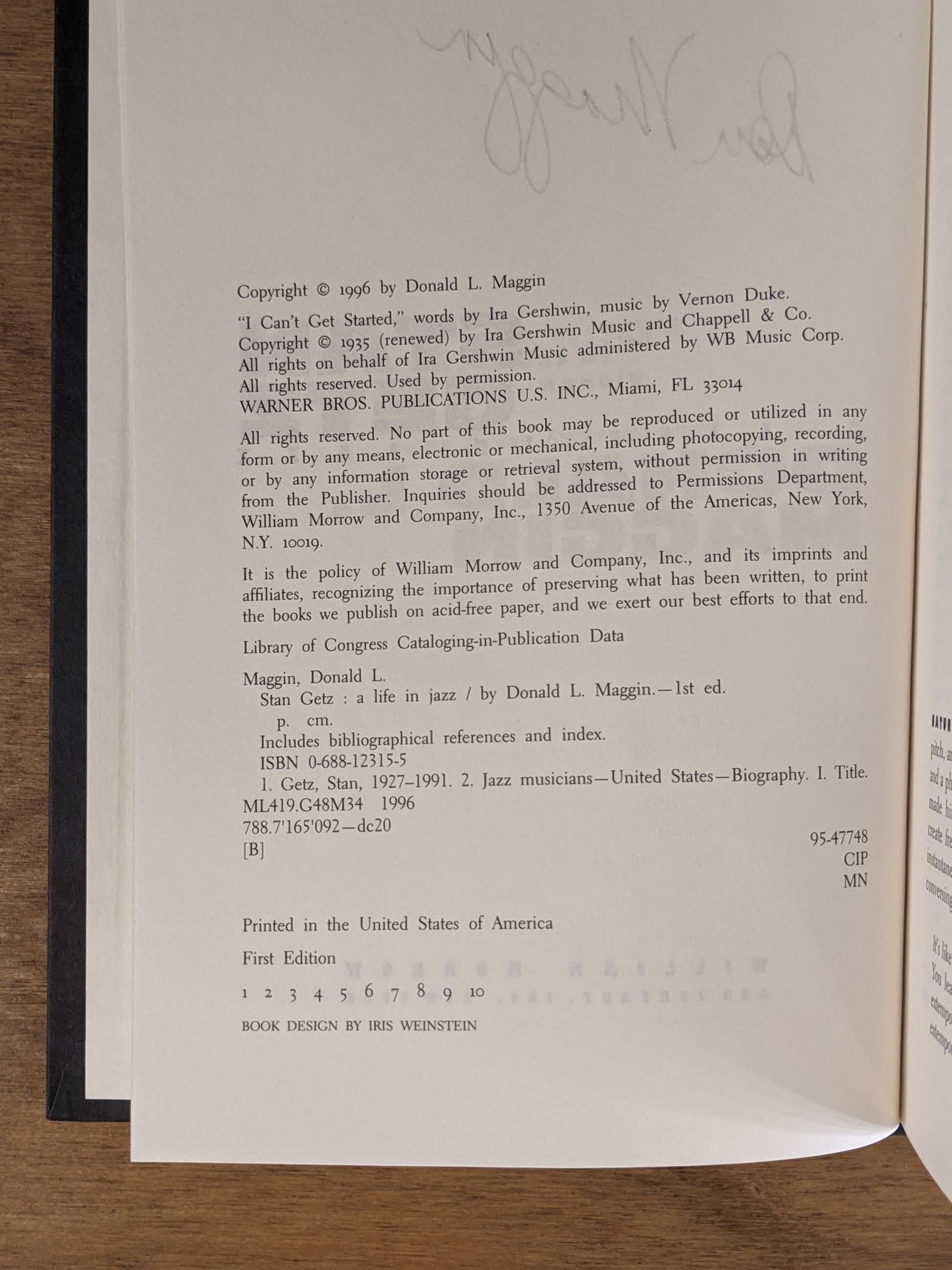 First Printing with complete number line, SIGNED by the author on the title page. An admirable biography of the great tenor saxophonist, a carefully researched, well-written account of Getz's deeply troubled and difficult life, so tragically at odds with an extraordinary musical gift which made him in the words of jazz critic, Gary Giddins, "the defiant romantic of postwar jazz, a modernist of unmistakable yearning lyricism and a virtuoso who dazzled critics and the public alike". In black boards, spine ends slightly pushed, else about fine, clean, tight, unmarked; in a like dust jacket, unclipped, with touch of shelf wear. Quite uncommon signed copy in collectible condition. J100